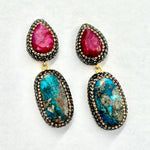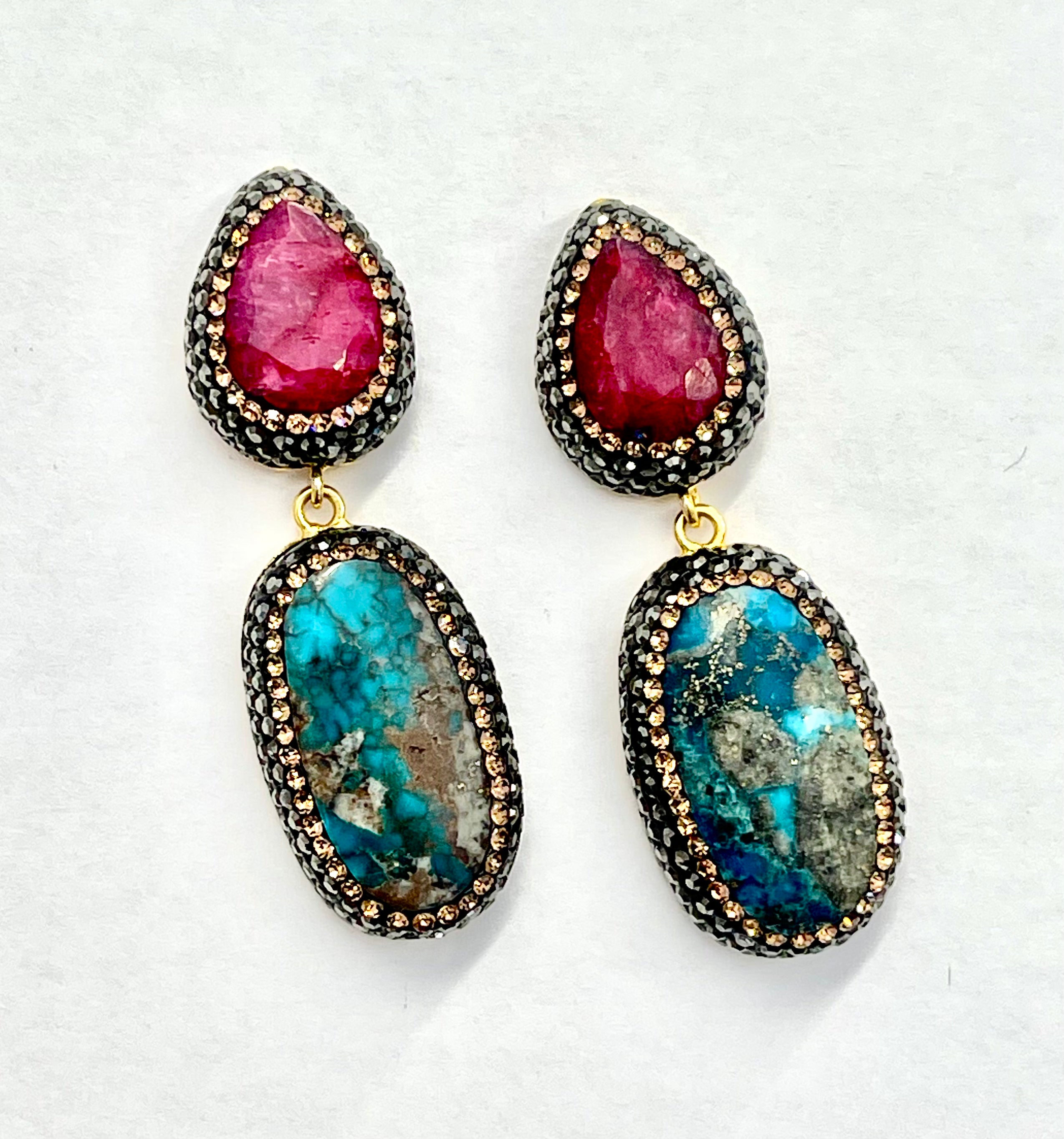 These eye-catching double drop earrings feature genuine rubies and turquoise gemstones, set within sparkling Swarovski crystals.