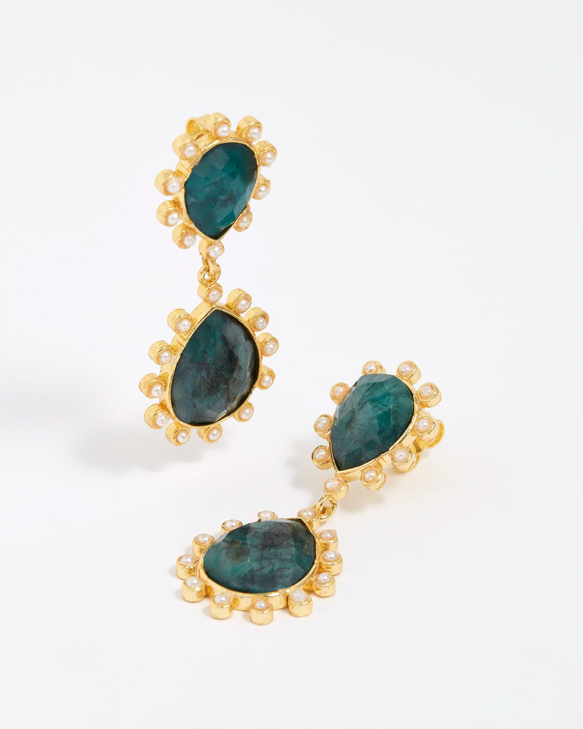 Our emerald Elsa Earrings are beautifully handmade using teardrop shaped natural emerald gemstones and surrounded by mini pearls, cast in 18k gold plated silver.