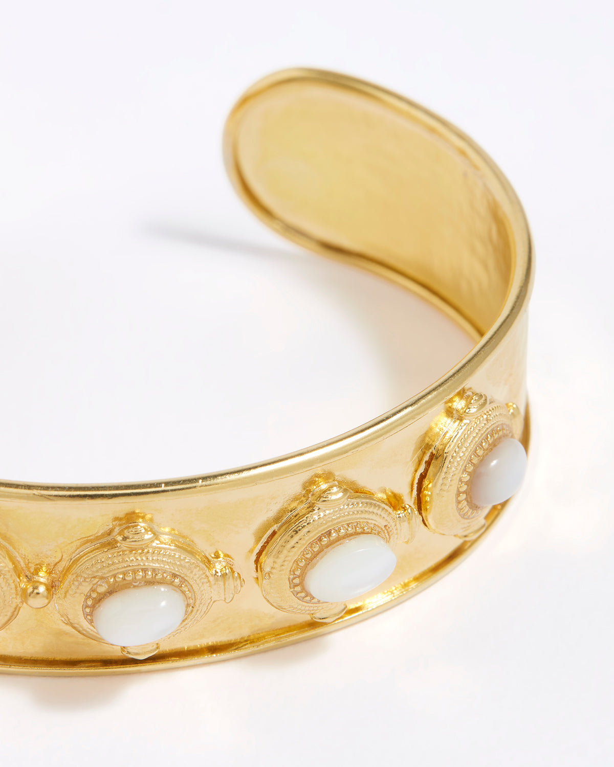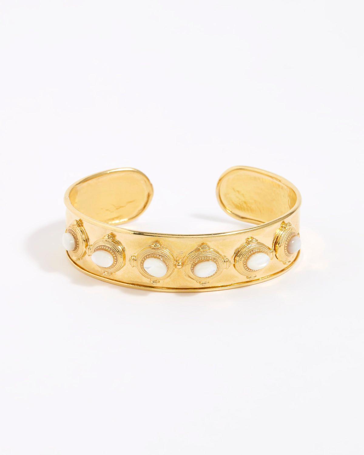 Gold cuff with intricate design and 6 small oval mother of pearls shown on a white background