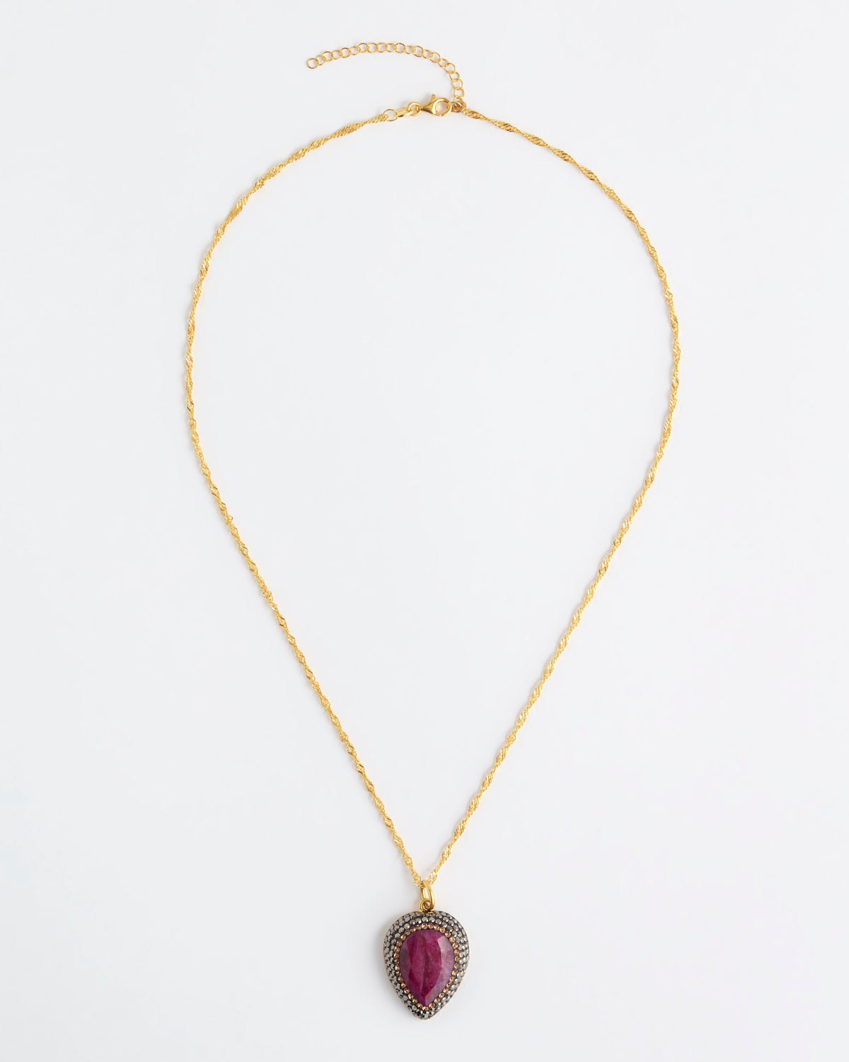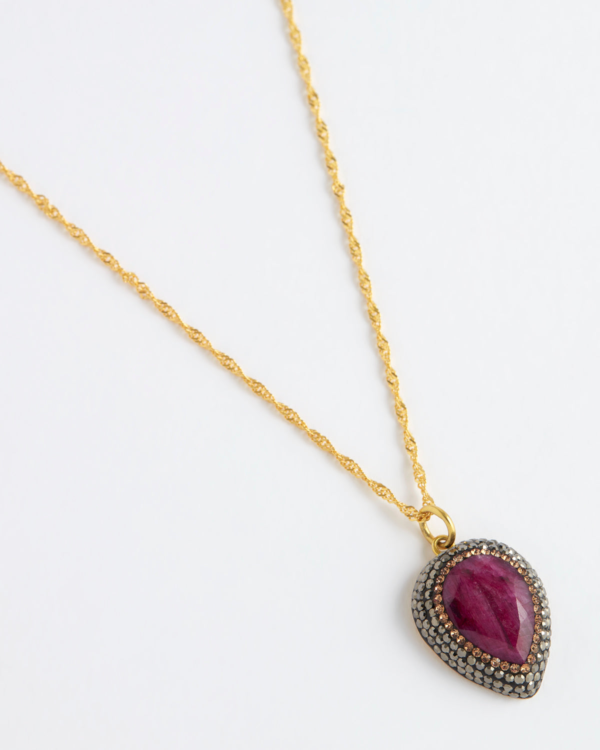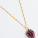 Ruby pear shaped pendant necklace on gold chain with crystal boarder shown close up on models neck