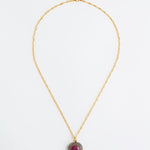 This beautiful necklace features a genuine, natural ruby gemstone pendant, set within sparkling multi-facetted crystals and hung from a delicate golden chain.