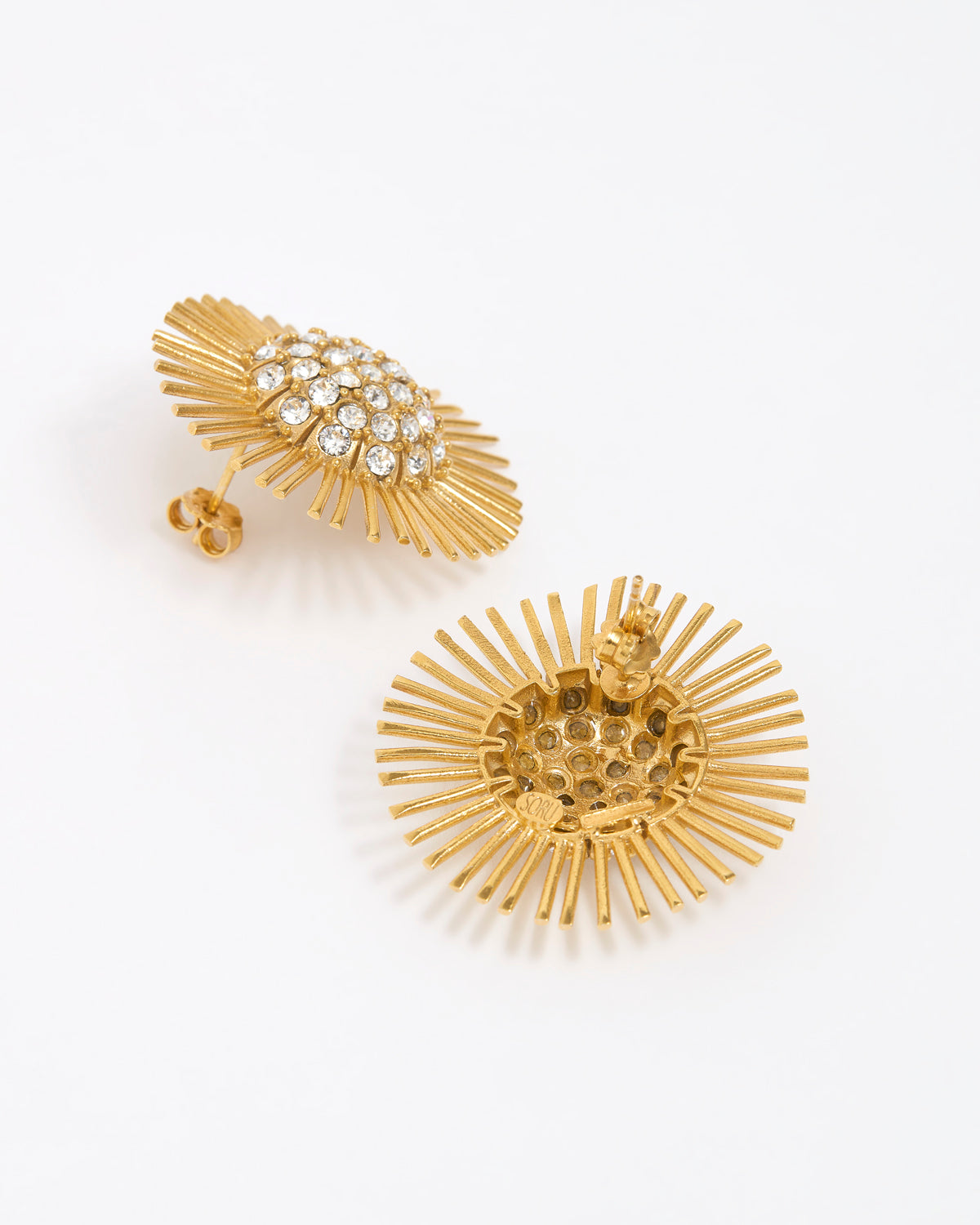 Featuring a circular cluster of clear crystals in the centre and surrounded by art deco style sunbeams, our Liberty Earrings are the perfect oversized accessory to add opulence to your collection.