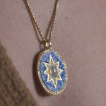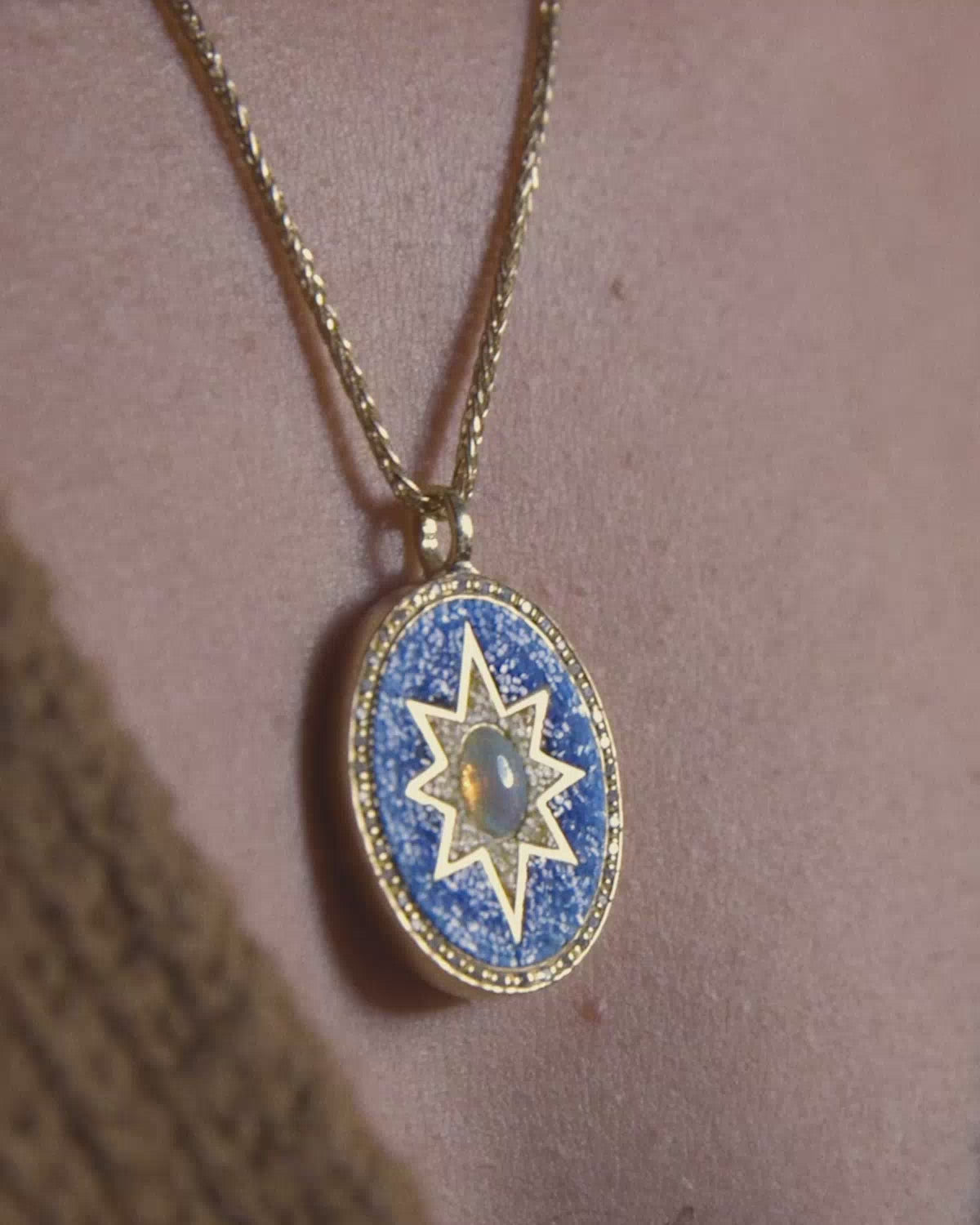 One of our most special pieces, inspired by historical depictions of astronomy, portraying an intricate starry blue sky.