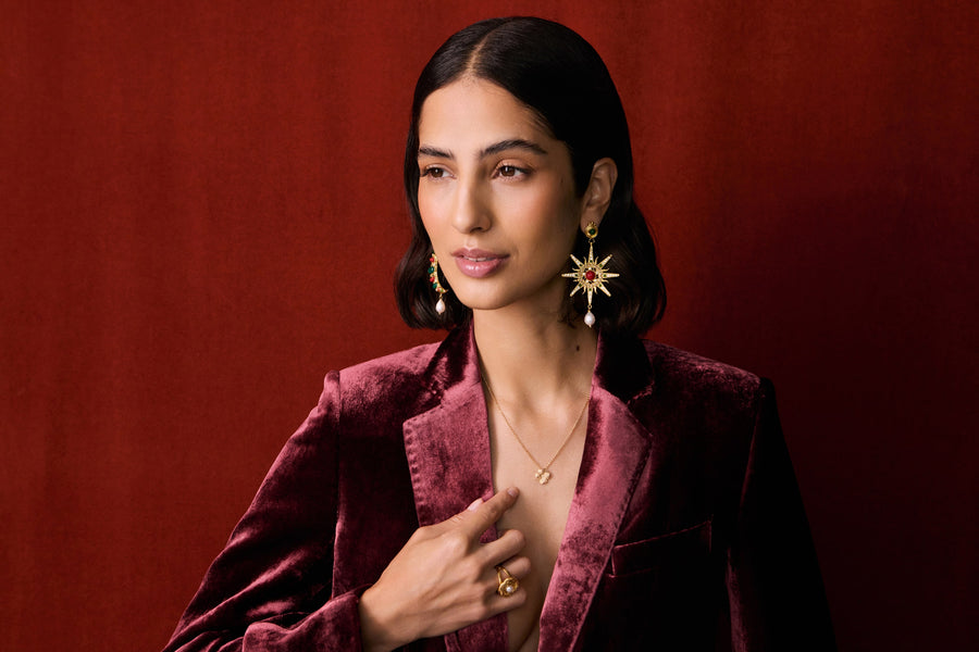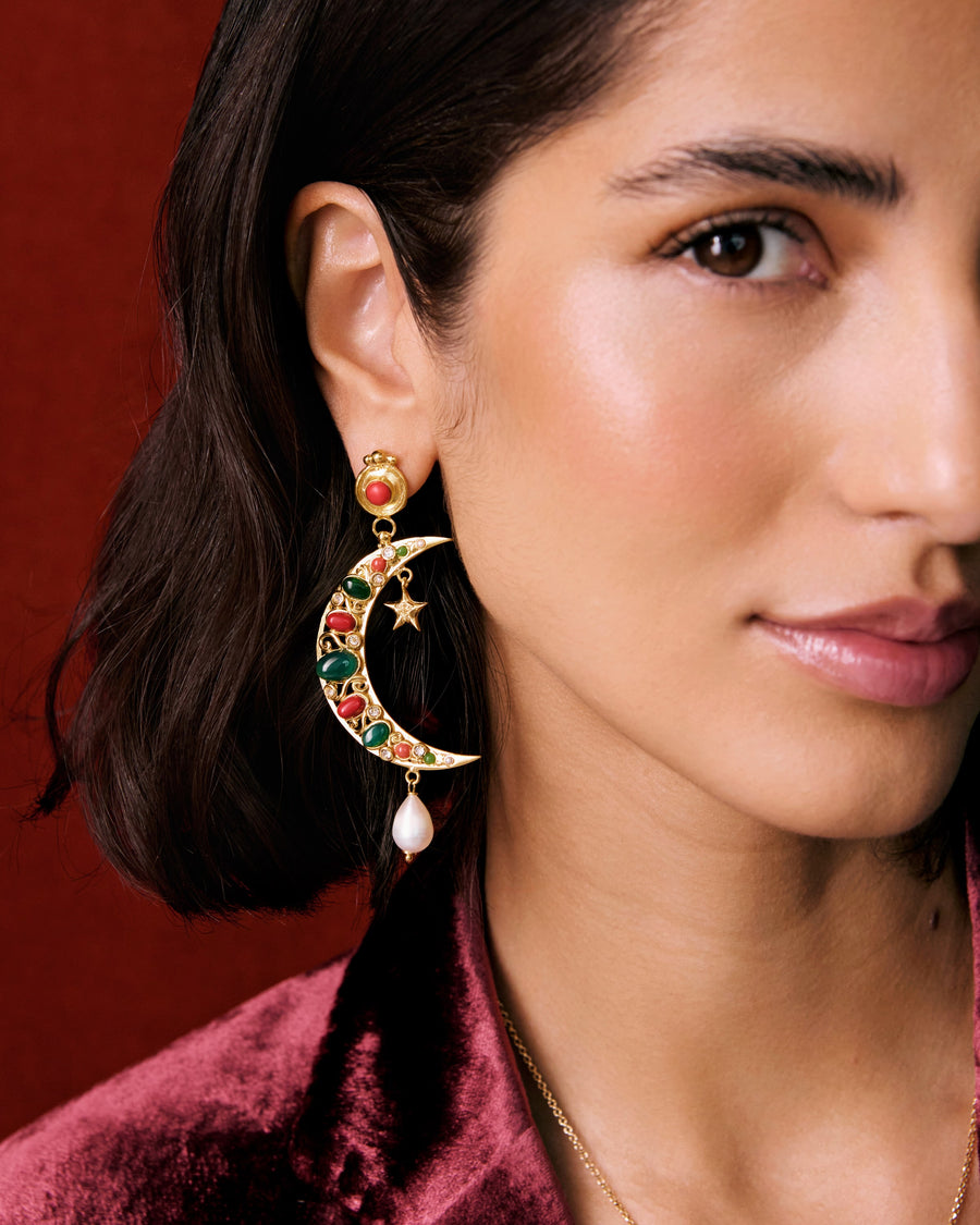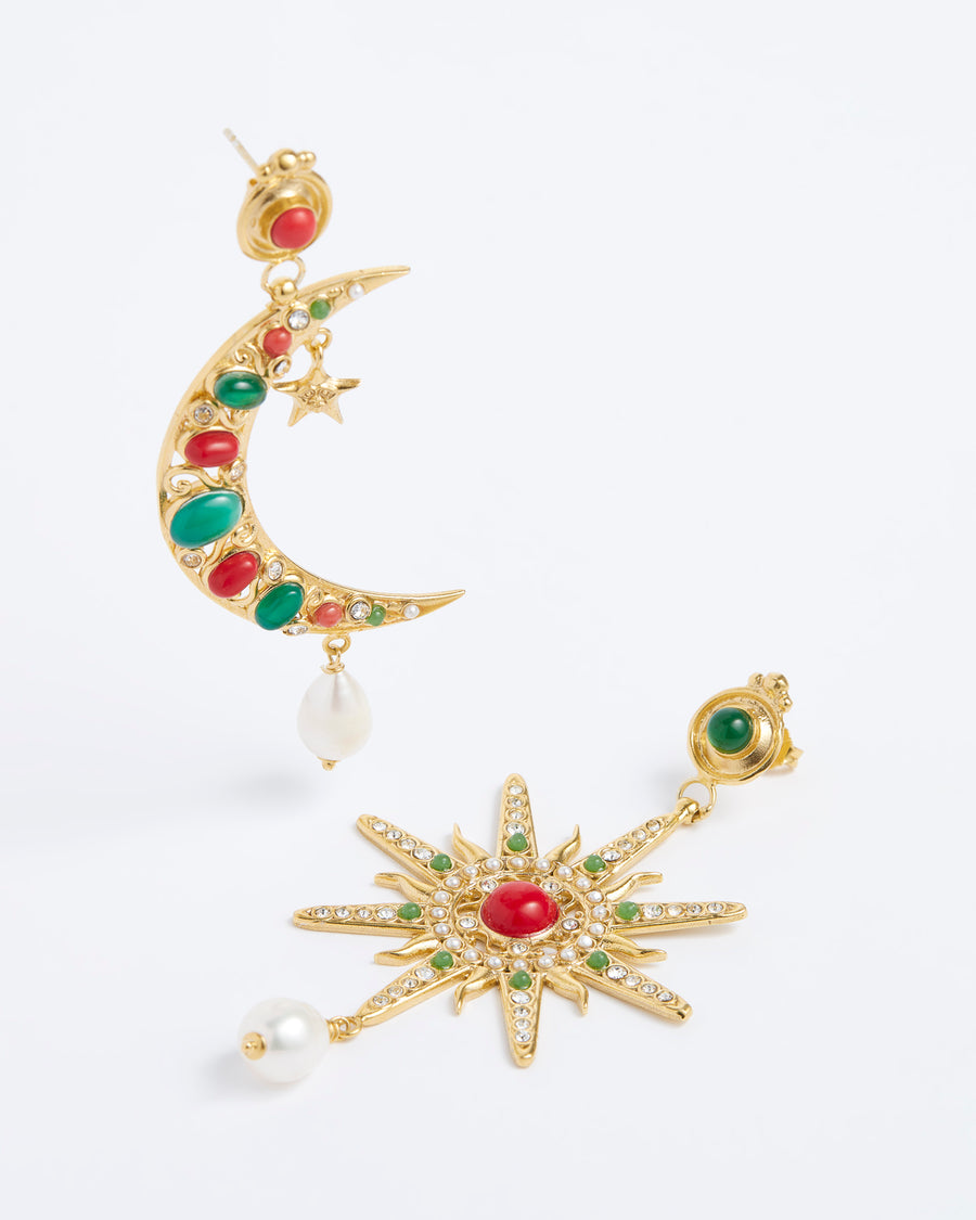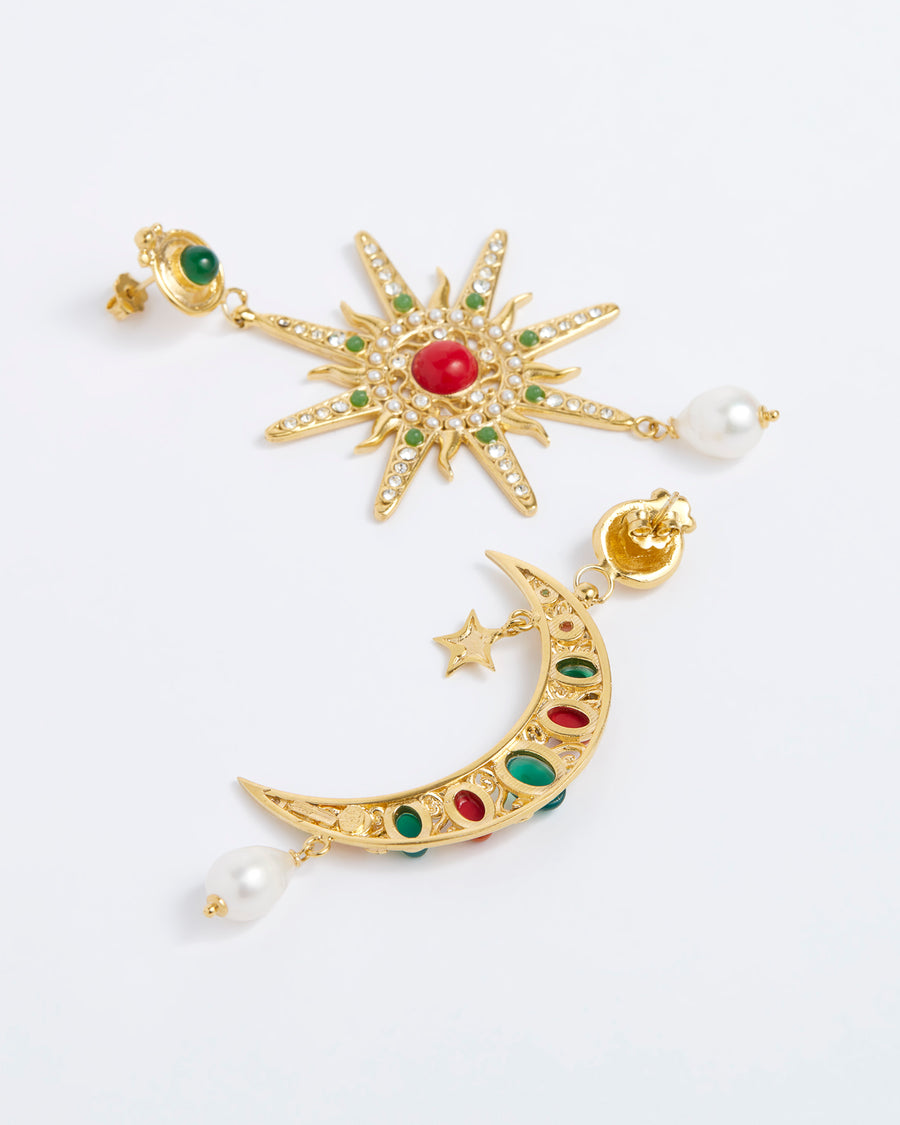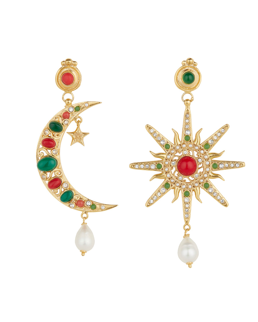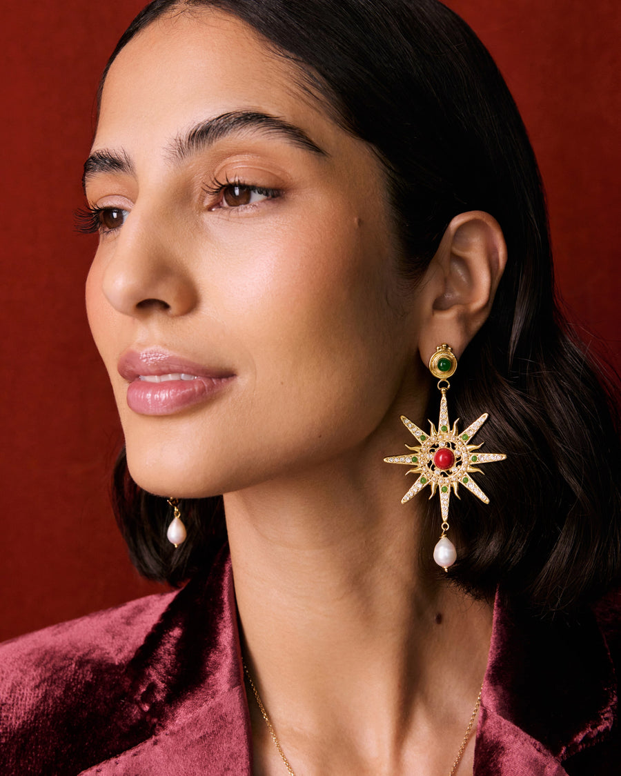 With intricate detailing, colourful green and red gemstones, mini baroque pearls all finished with hanging pearls and star, our mis-matched Aria Earrings are a work of art and will be a treasured forever.
