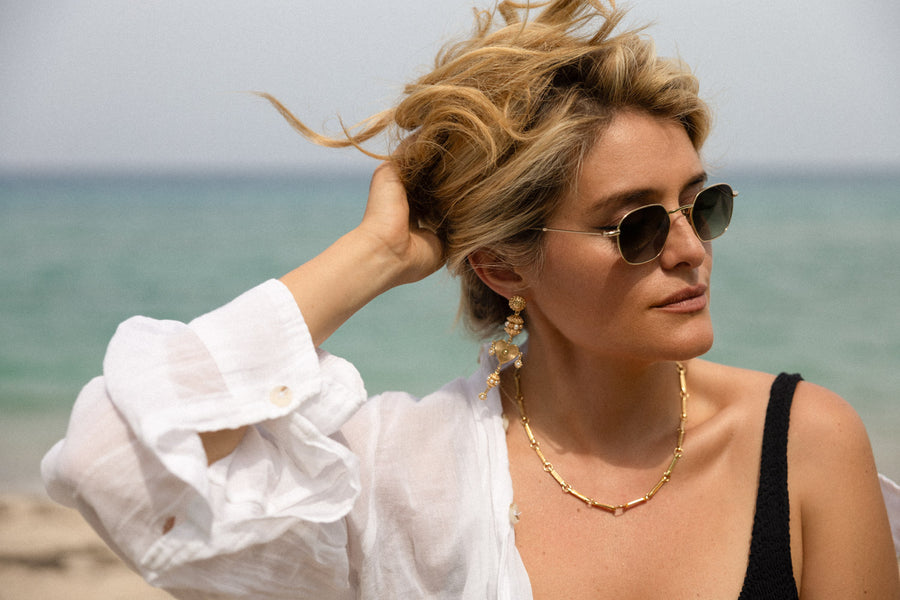 Daphne Oz wearing gold bar necklace and horseshoe charm by Soru Jewellery