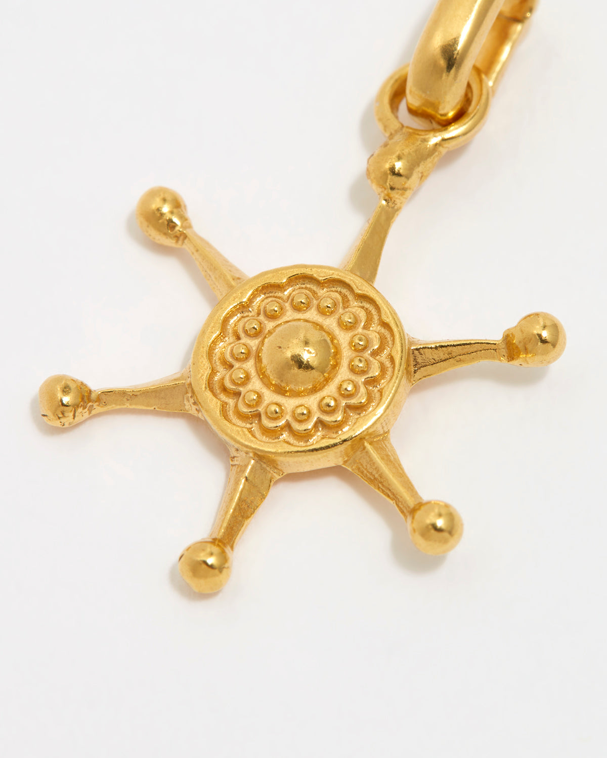A cute, mini nautical inspired charm in the shape of a ships wheel, with intricate detailing to the 18k gold plated silver, all made by hand in Italy. What better charm to remind you or a loved one of those special vacation moments or of those big dreams.