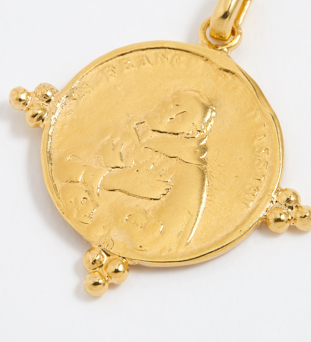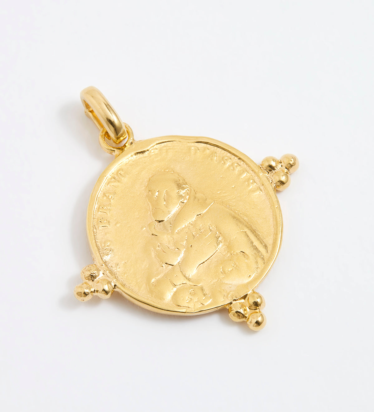 Close up product shot of gold detailed coin charm on a white background