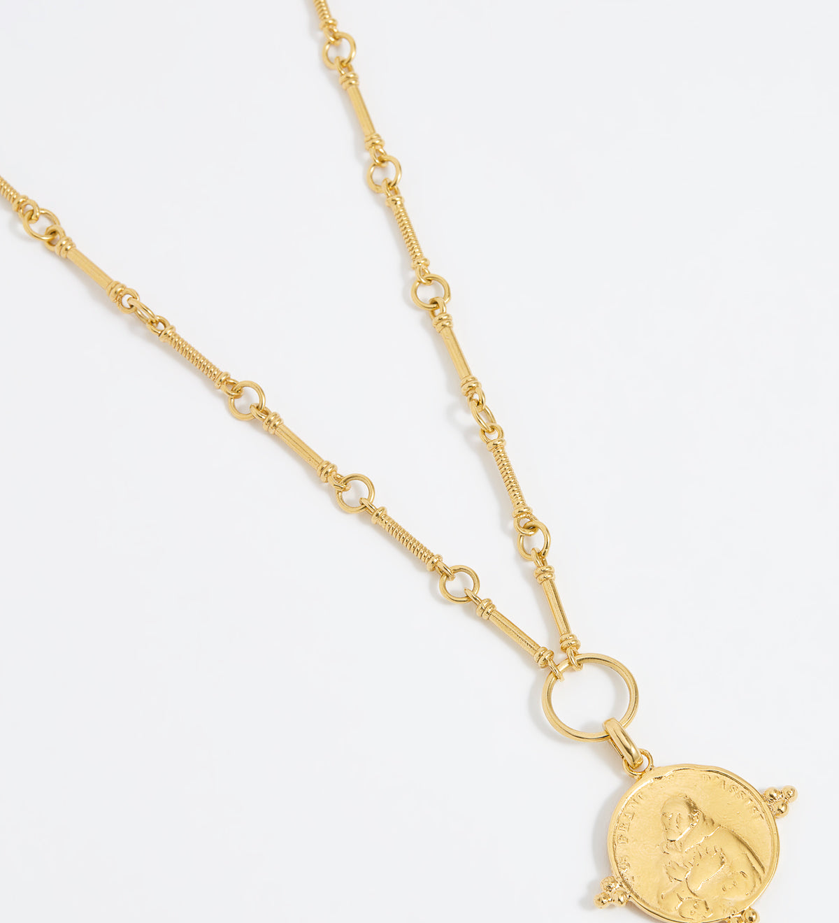Product shot of Soru Jewellery gold detailed coin charm attached to a Soru link charm chain on a white background