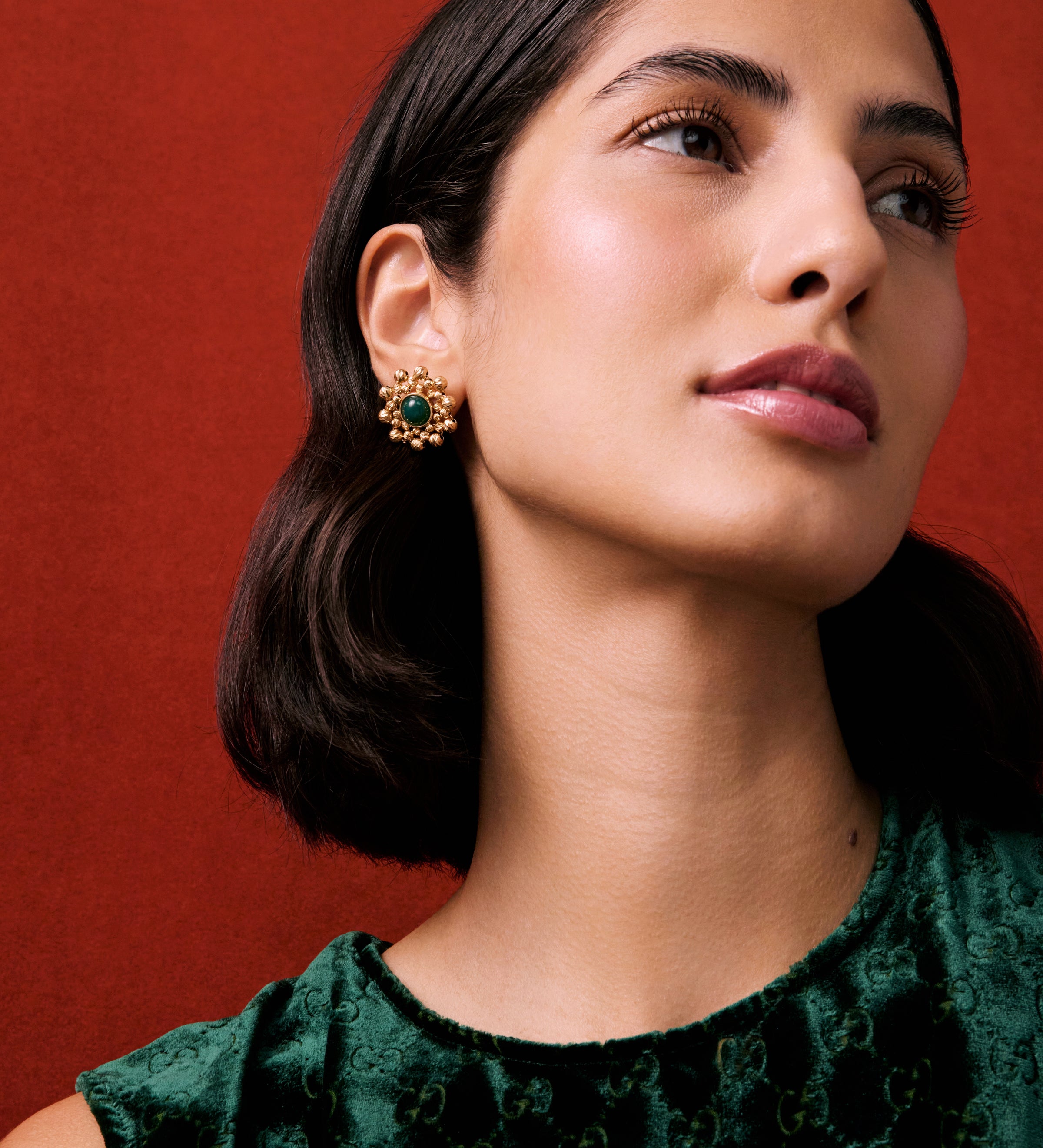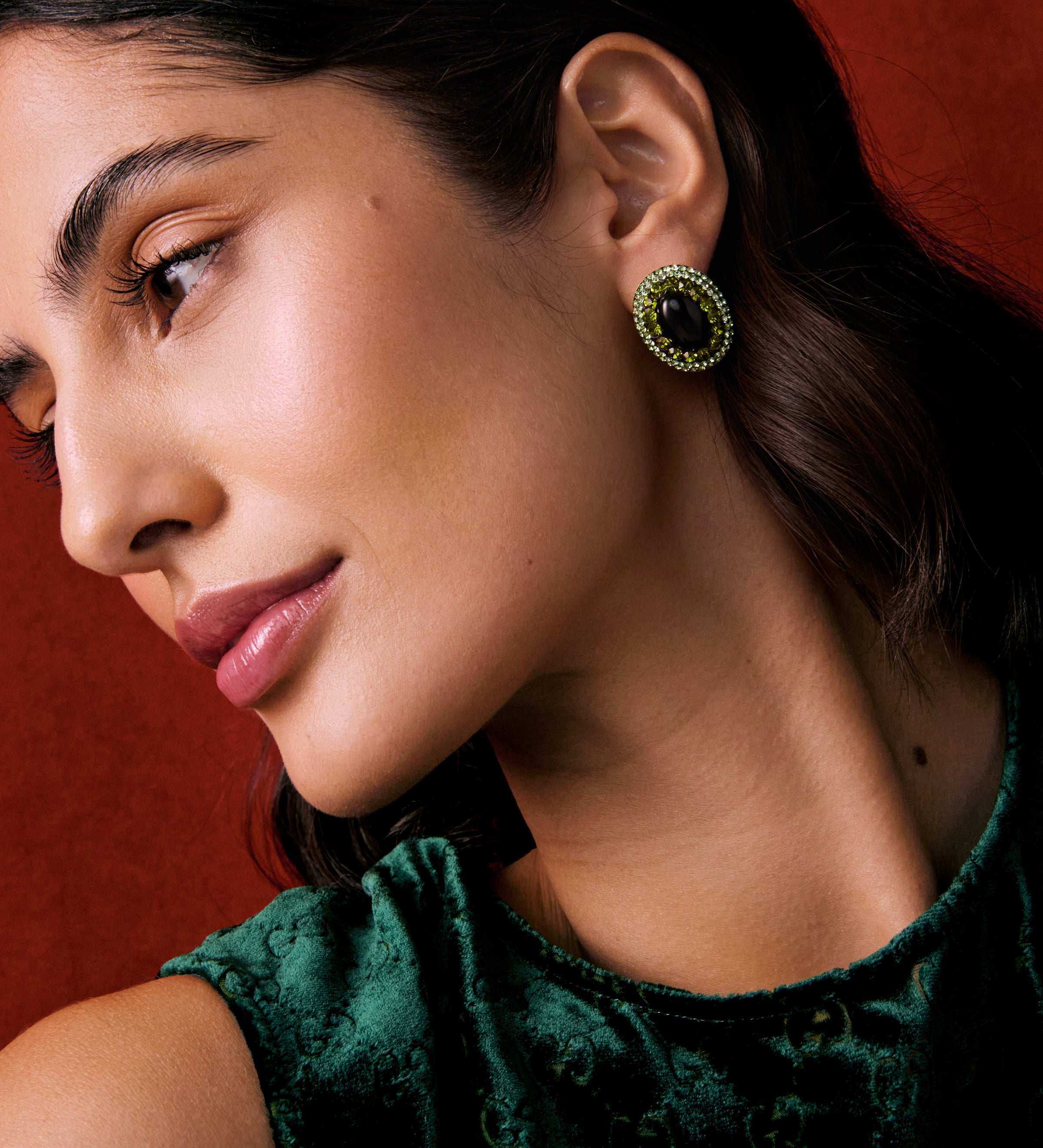 Model shot of lady wearing statement gold earrings with circular top and rectangular drop, with an organic and etched antique finish, on a red background.