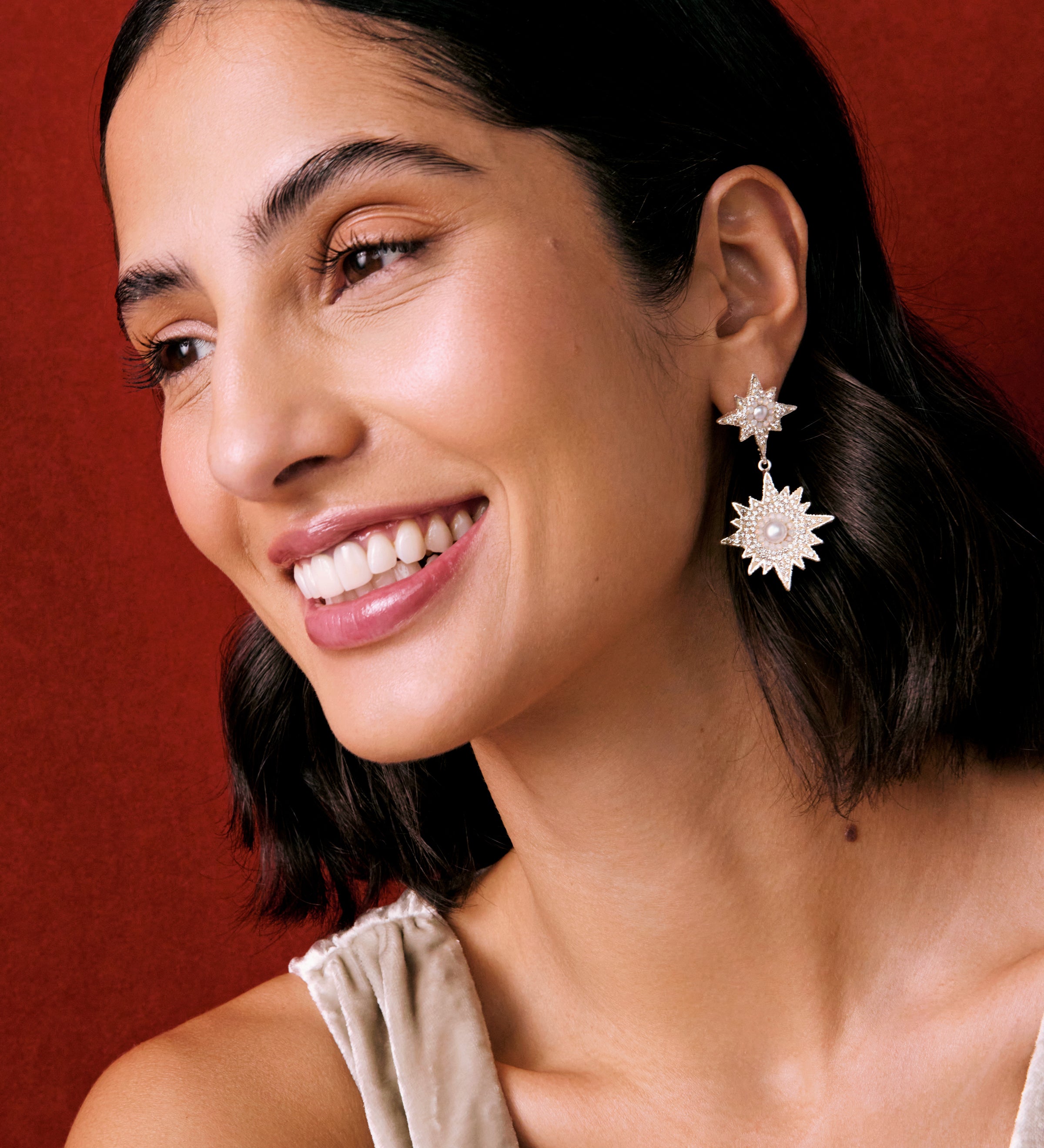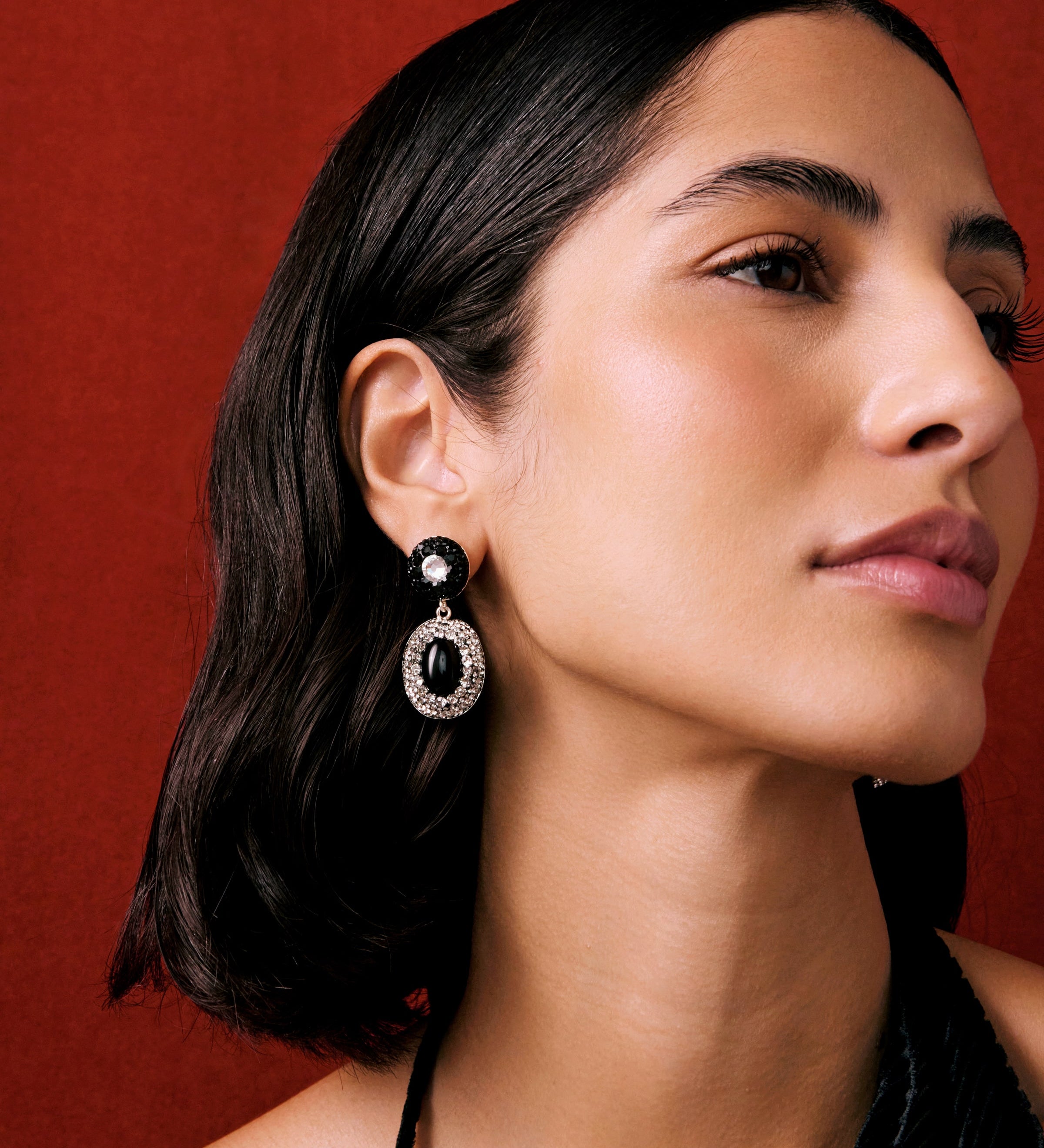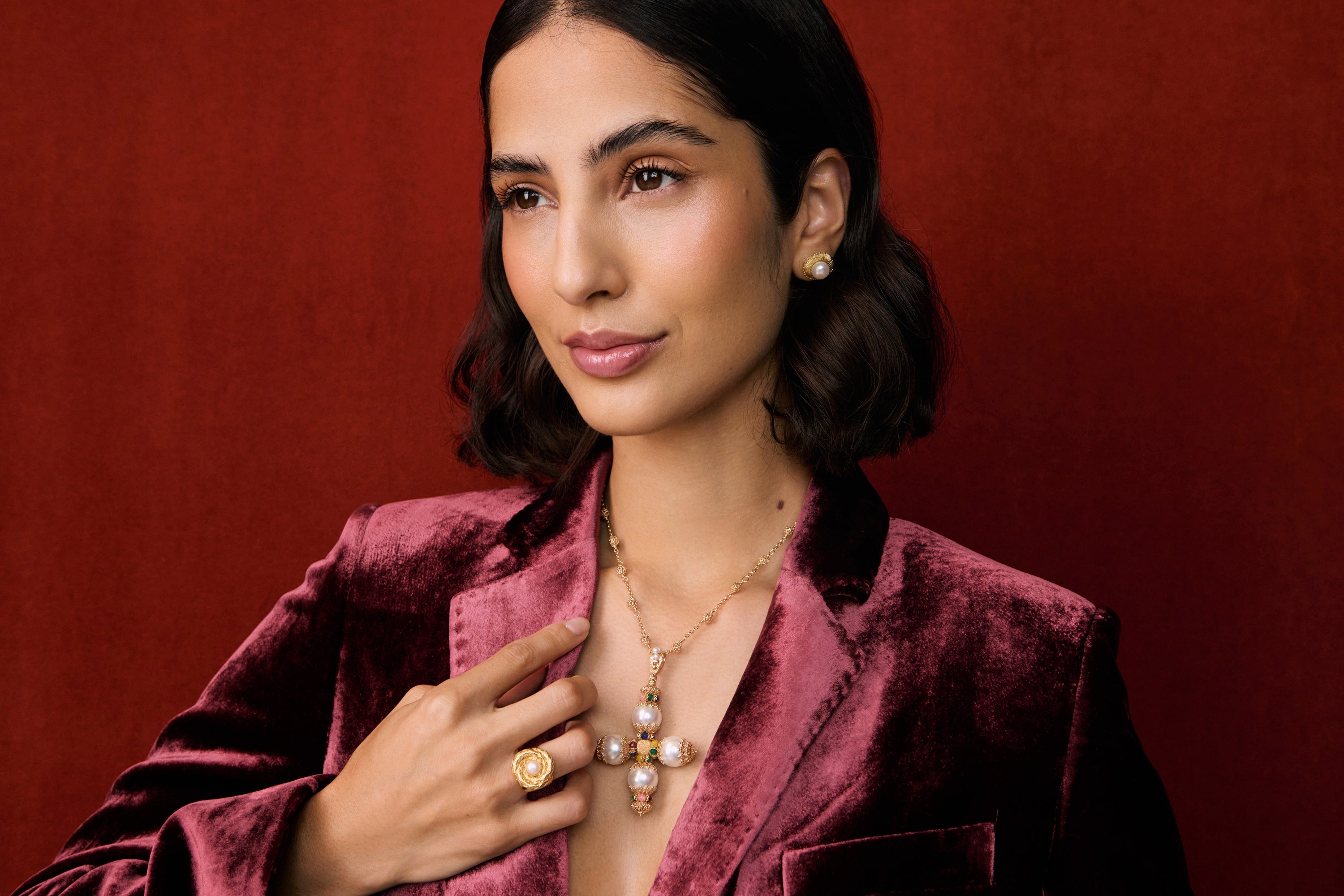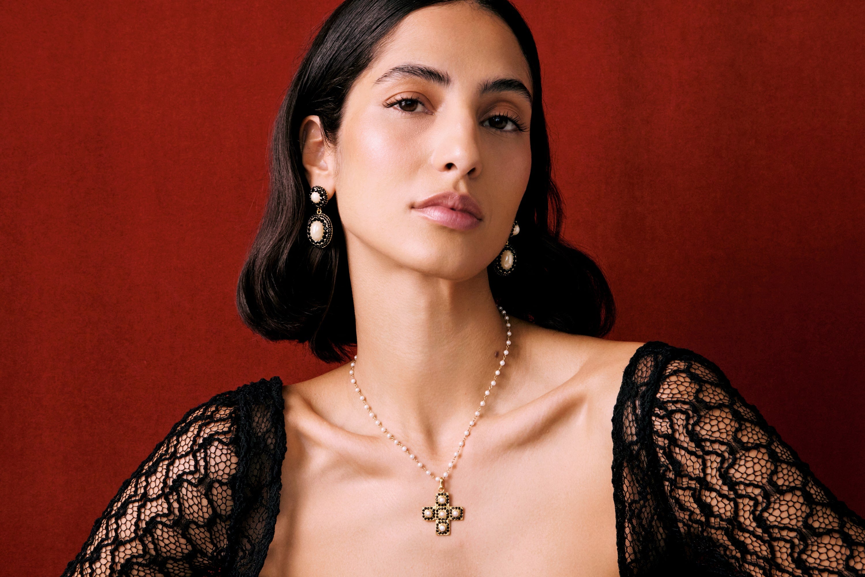 Model wearing big gold heart earrings in lace top, with red background. Promoting the Soru Palermo collection of jewellery