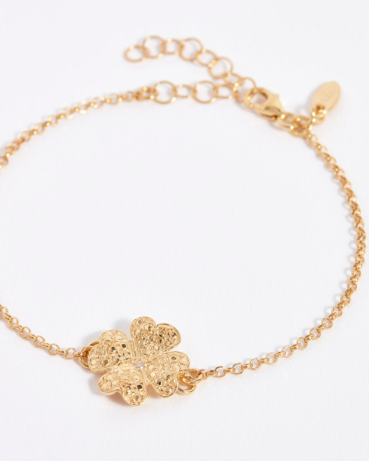 The four-leaf clover is a global symbol of good fortune and prosperity, with origins in ancient Celtic folklore. This solid gold clover features a textured matte and polished gold surface, offering a subtle sparkle, and at its centre sits a brilliant cut clear diamond. With a delicate gold chain, this dainty and feminine bracelet can easily be worn everyday, alone or as part of a stack.
