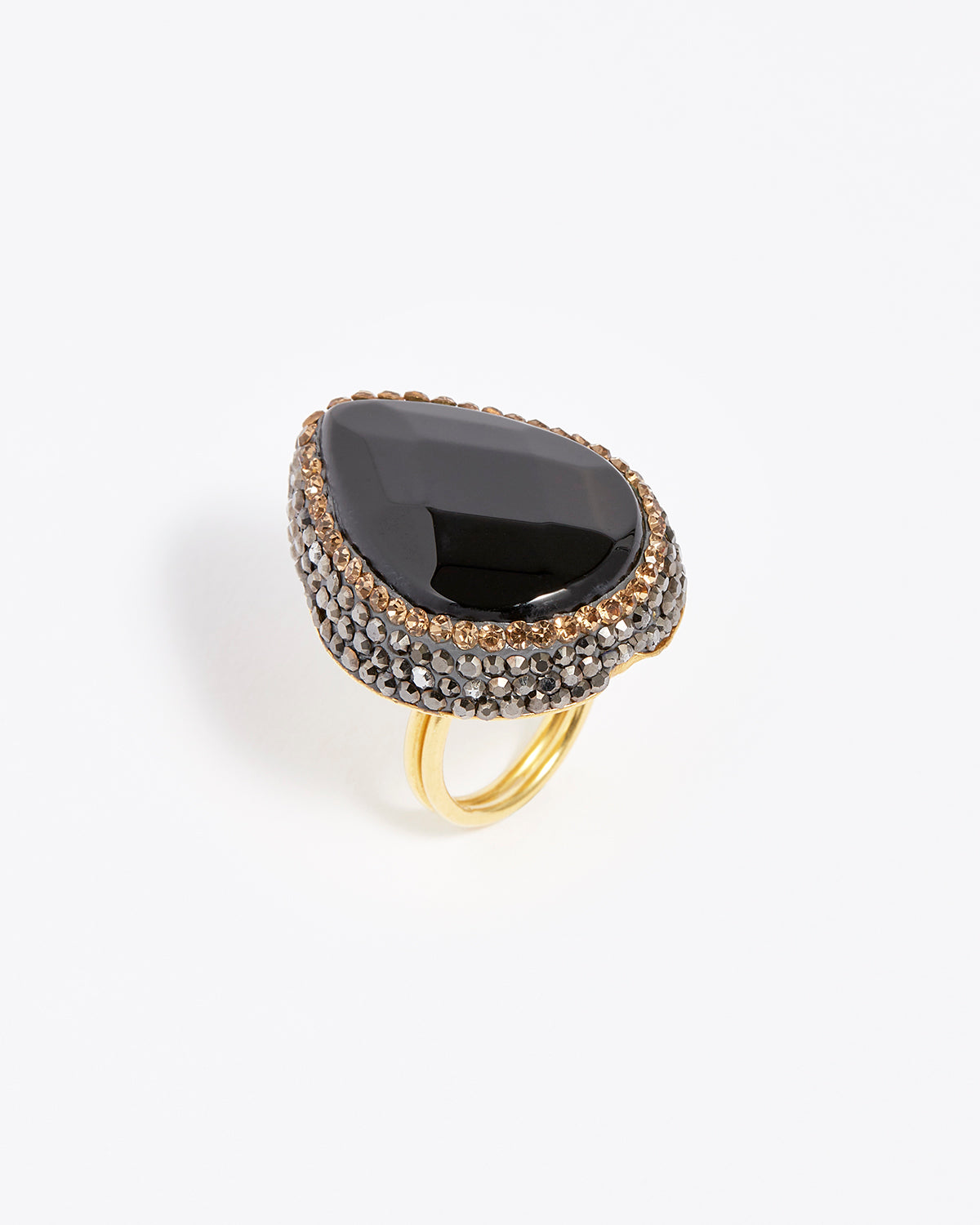 This ring features a black onyx gemstone set within sparkling crystals for a glamorous and chic look.