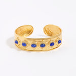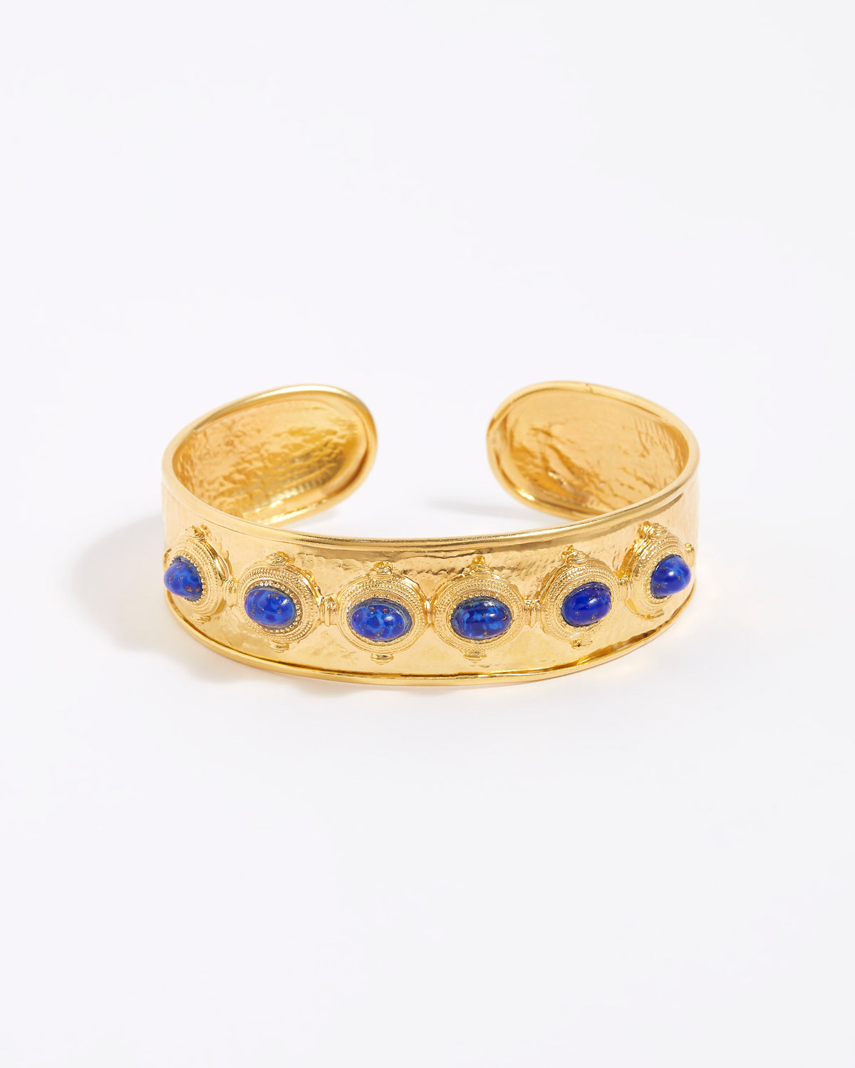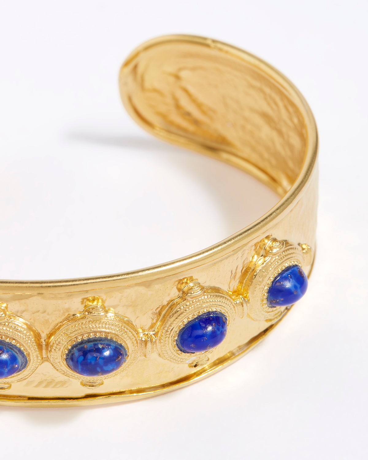 Our lightweight Lapis Astor Cuff bracelet is handcrafted using 18k gold plated silver and embellished with lapis gemstones, it can be sculpted to fit your wrist perfectly by pulling in or out.
