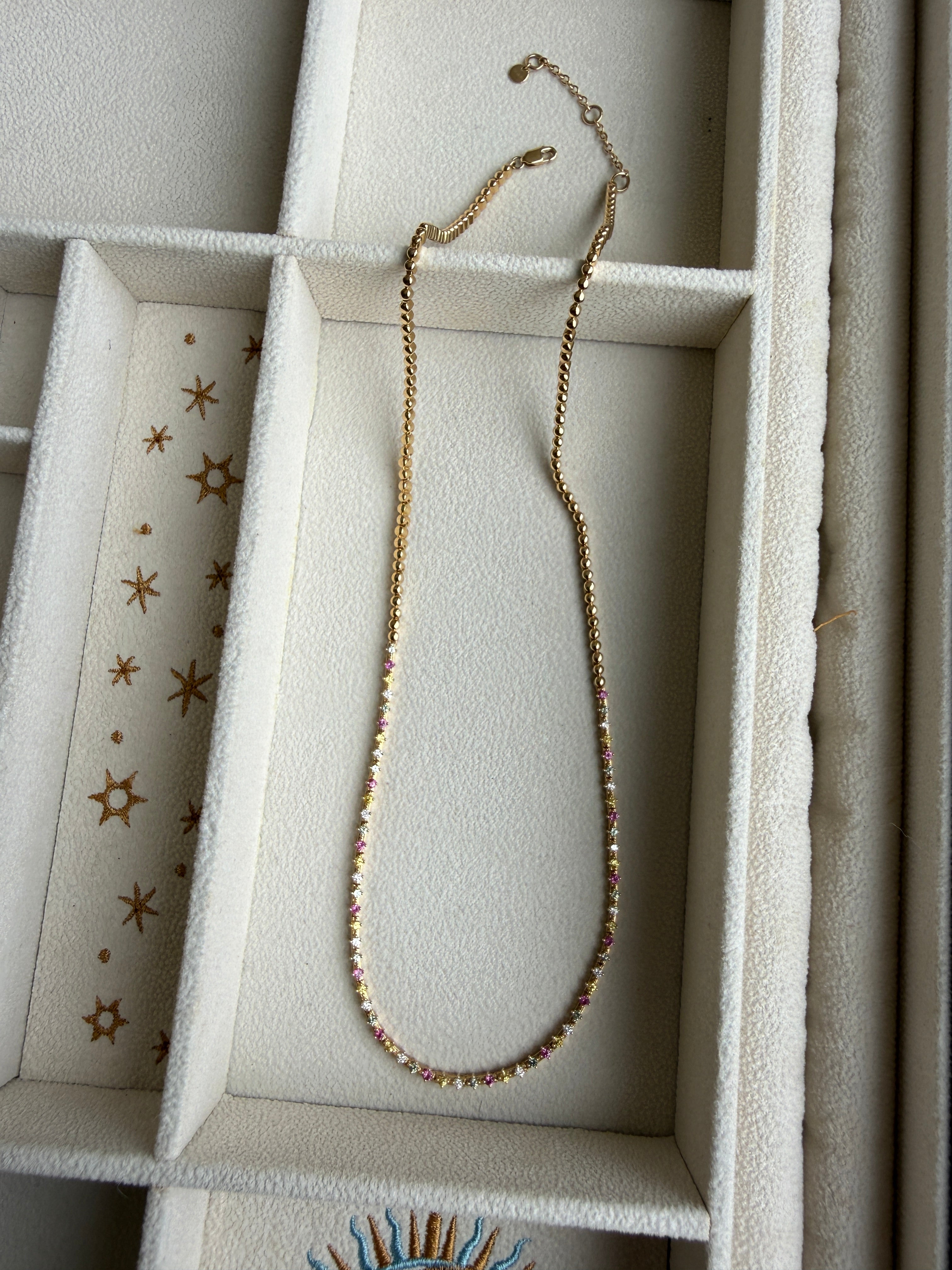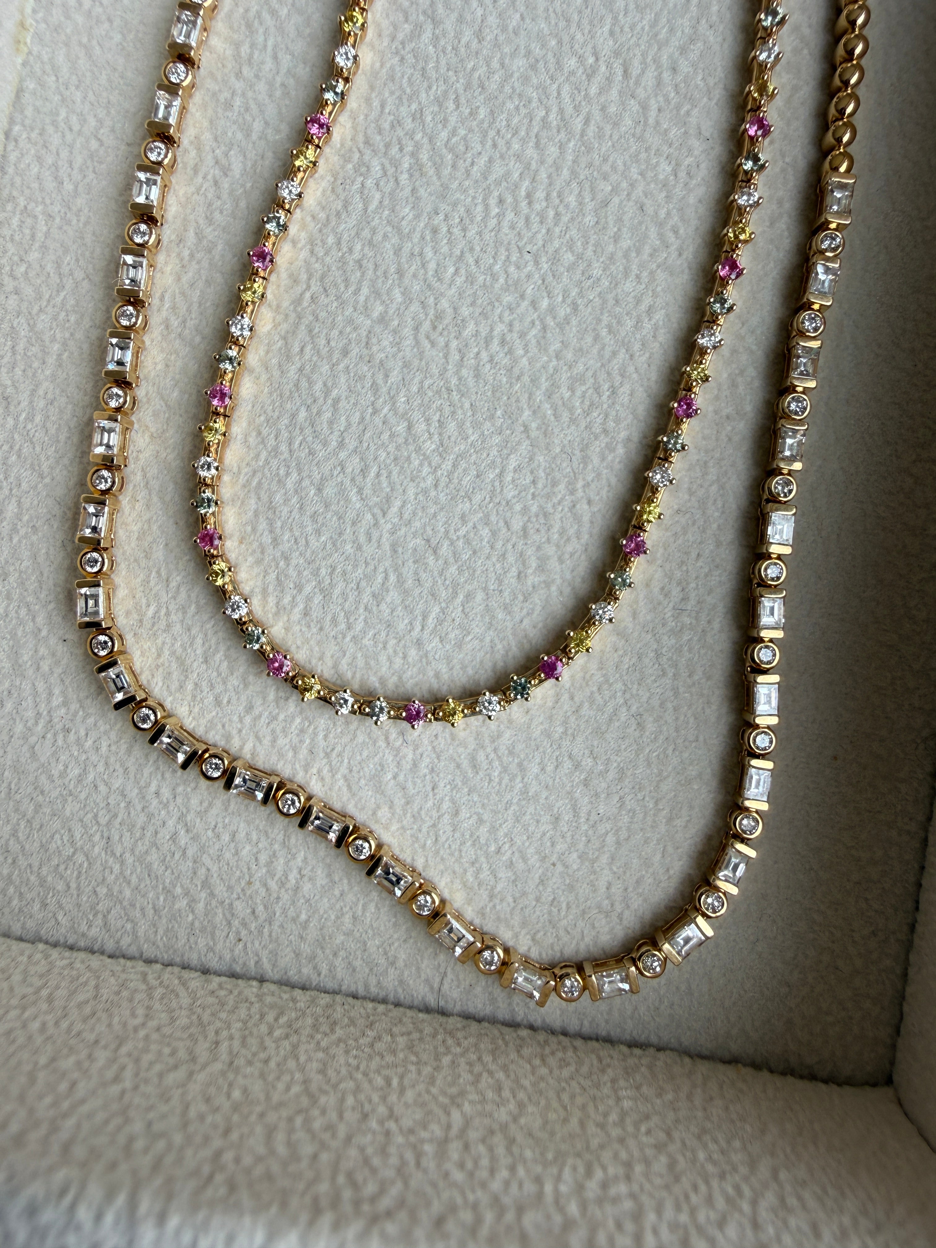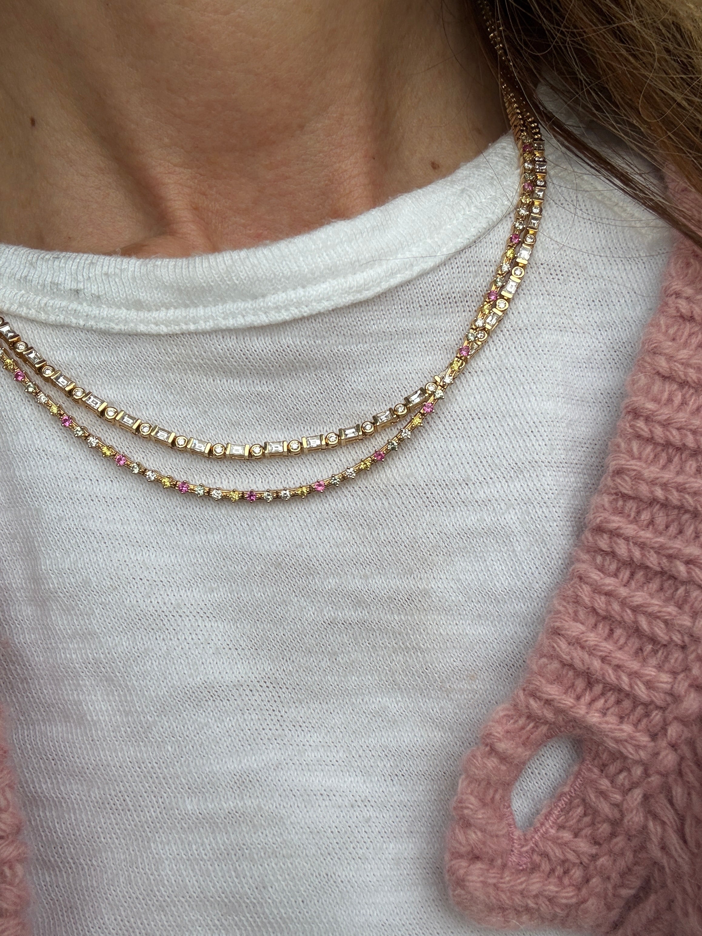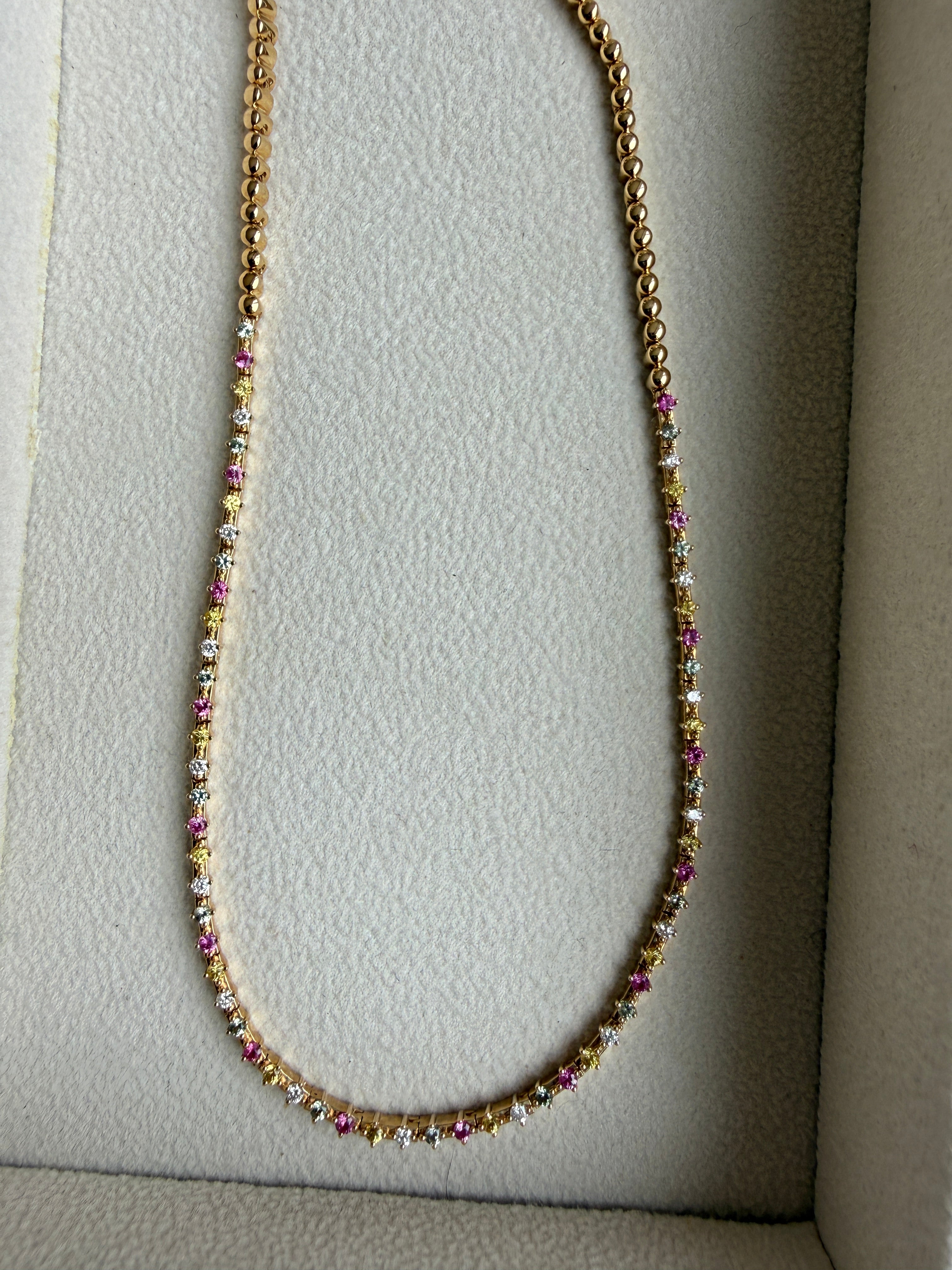 14k solid gold tennis necklace style with a mix of pastel coloured natural sapphires in light green, pink & yellow as well as natural diamonds.