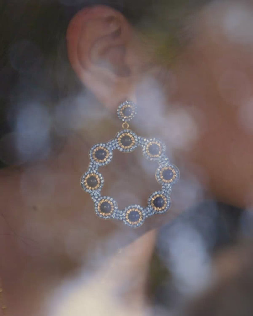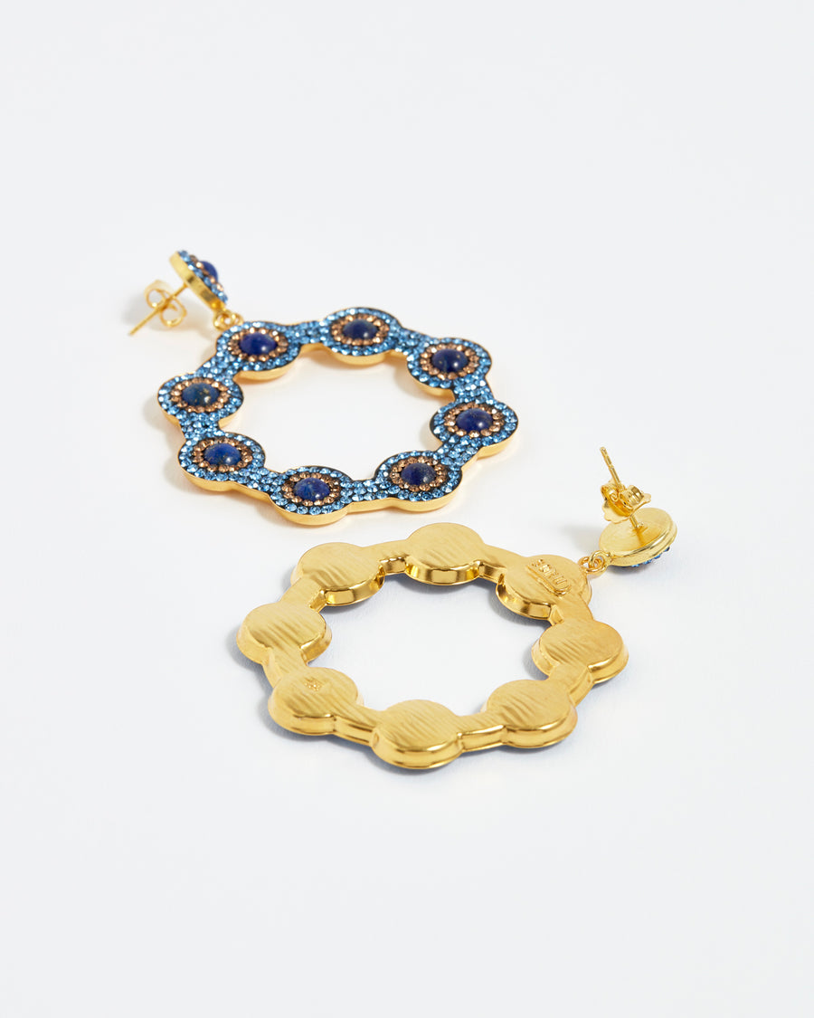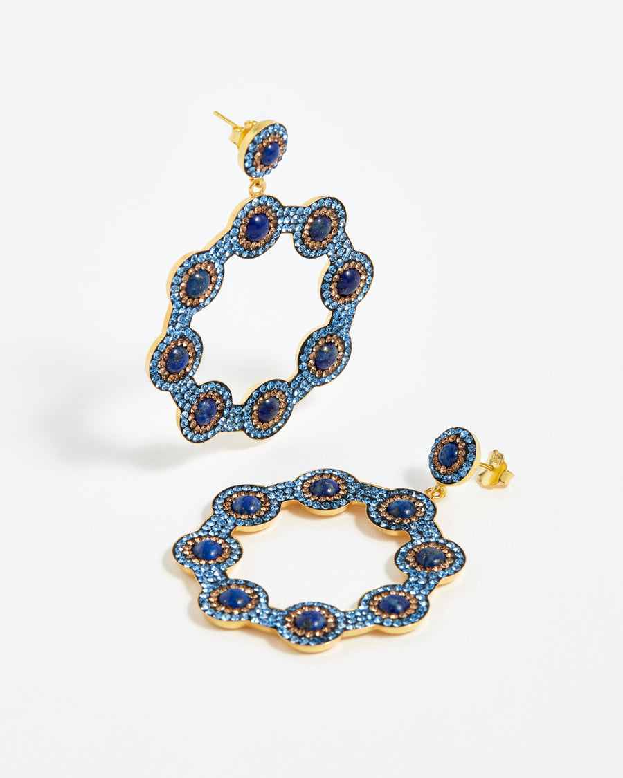 Inspired by traditional Italian pottery, these forward-facing hoop earrings feature lapis lazuli speckled gemstones set into multi-facetted crystals. These rich blue earrings are perfect for making a colourful statement.
