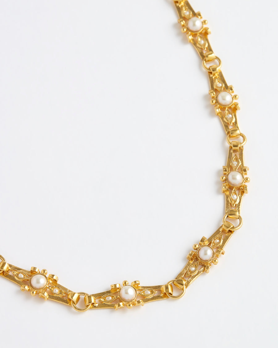 This beautifully detailed vintage style necklace has chunky curved links featuring mixed size pearls with a chic art deco vibe.