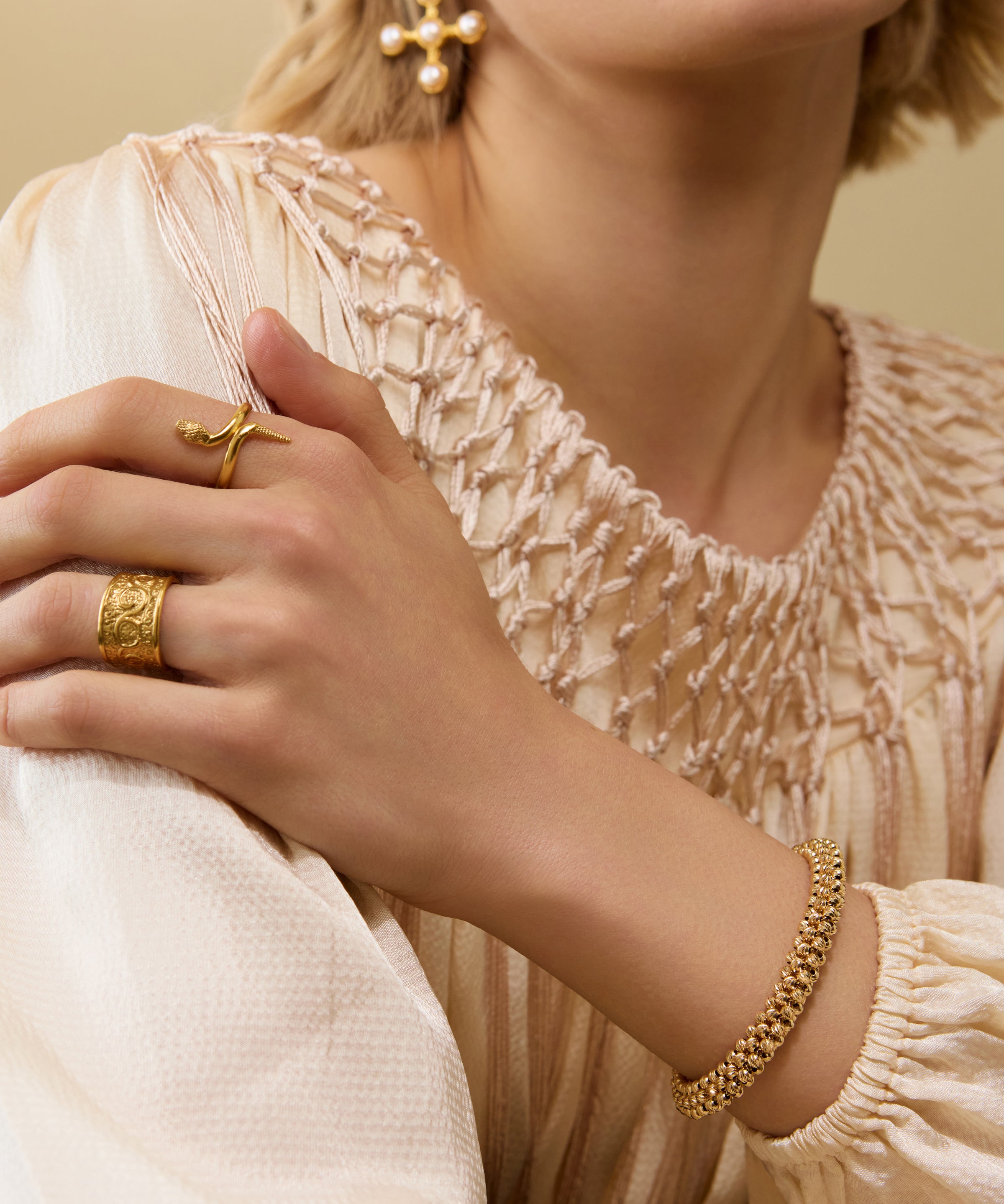 Chapter 1: Roman Holiday draws on the elegance of a summer city escape. Think geometric chains echoing skyline silhouettes, bold studs made for tailored short suits, and pearls with a pop of green for rooftop dinners. Vintage influences meet modern elegance - perfect with linen, sharp tailoring, or just a fresh tan.