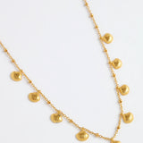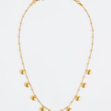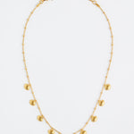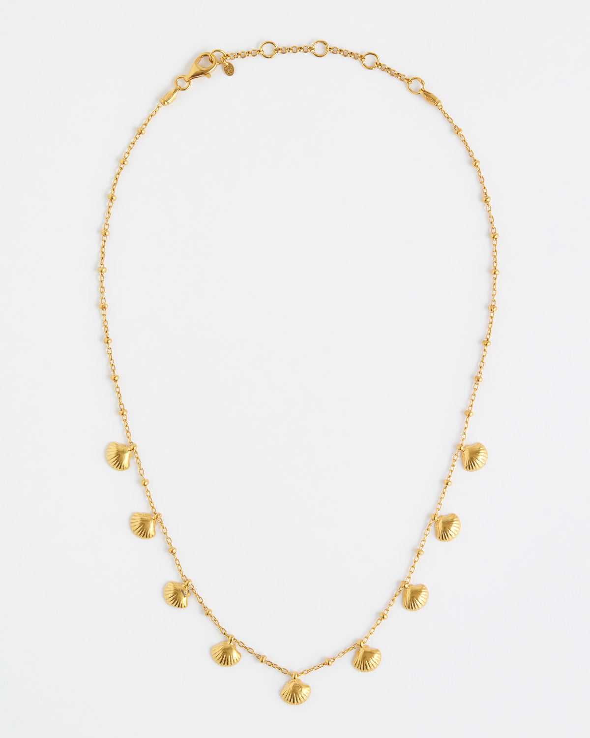product shot of yellow gold plated necklace with mini shells attached around the necklace