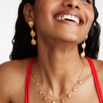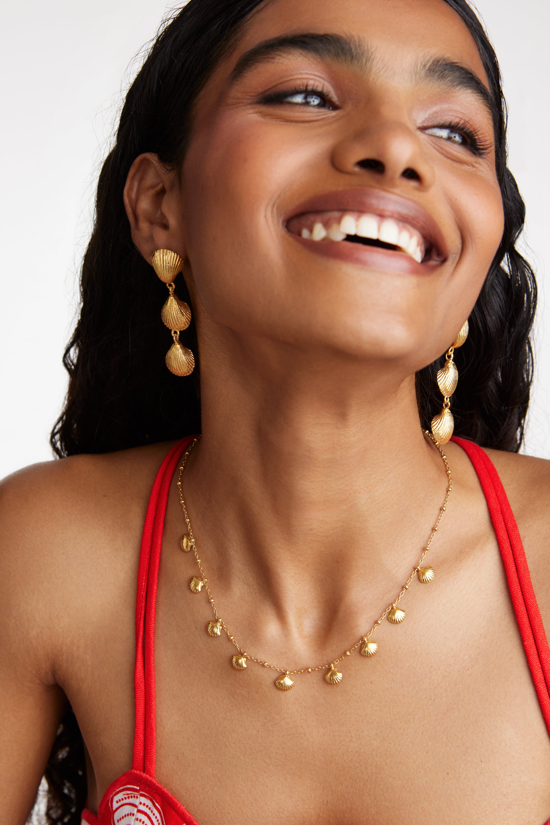 Smiling Model shot wearing the Soru Jewellery gold shell drop earrings with a mini shell necklace
