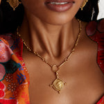 model shot wearing Soru Jewellery gold coin charm on a charm chain with matching earrings