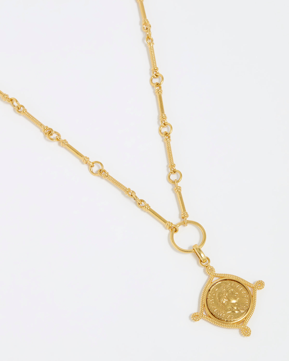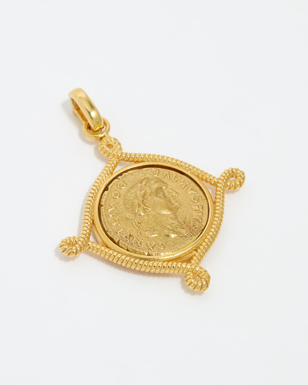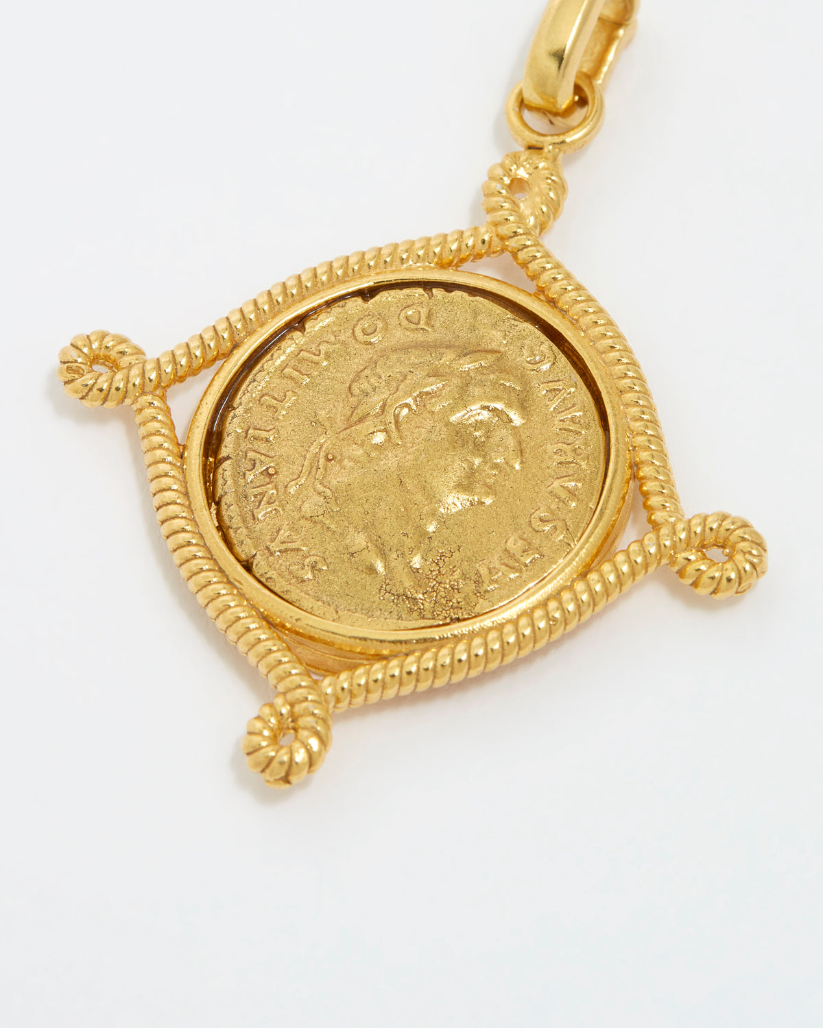This Roman inspired coin charm has a vintage feel with an intricate rope style boarder. Handcrafted in Italy using 18k gold plated silver.
