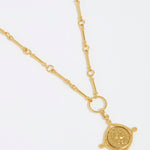 Product shot of Soru Jewellery gold coin charm attached to a charm chain on a white background