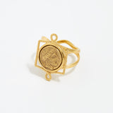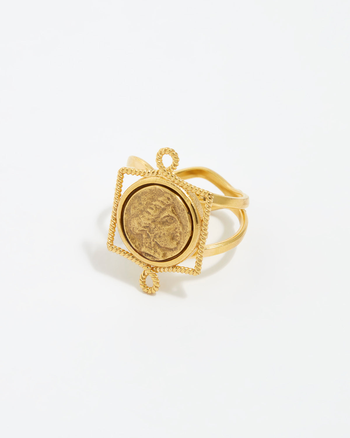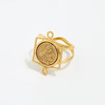 A standout vintage inspired ring featuring a Roman coin design, surrounded by a twisted rope detailed boarder. Thoughtfully handcrafted in Italy using 18k gold plated silver.