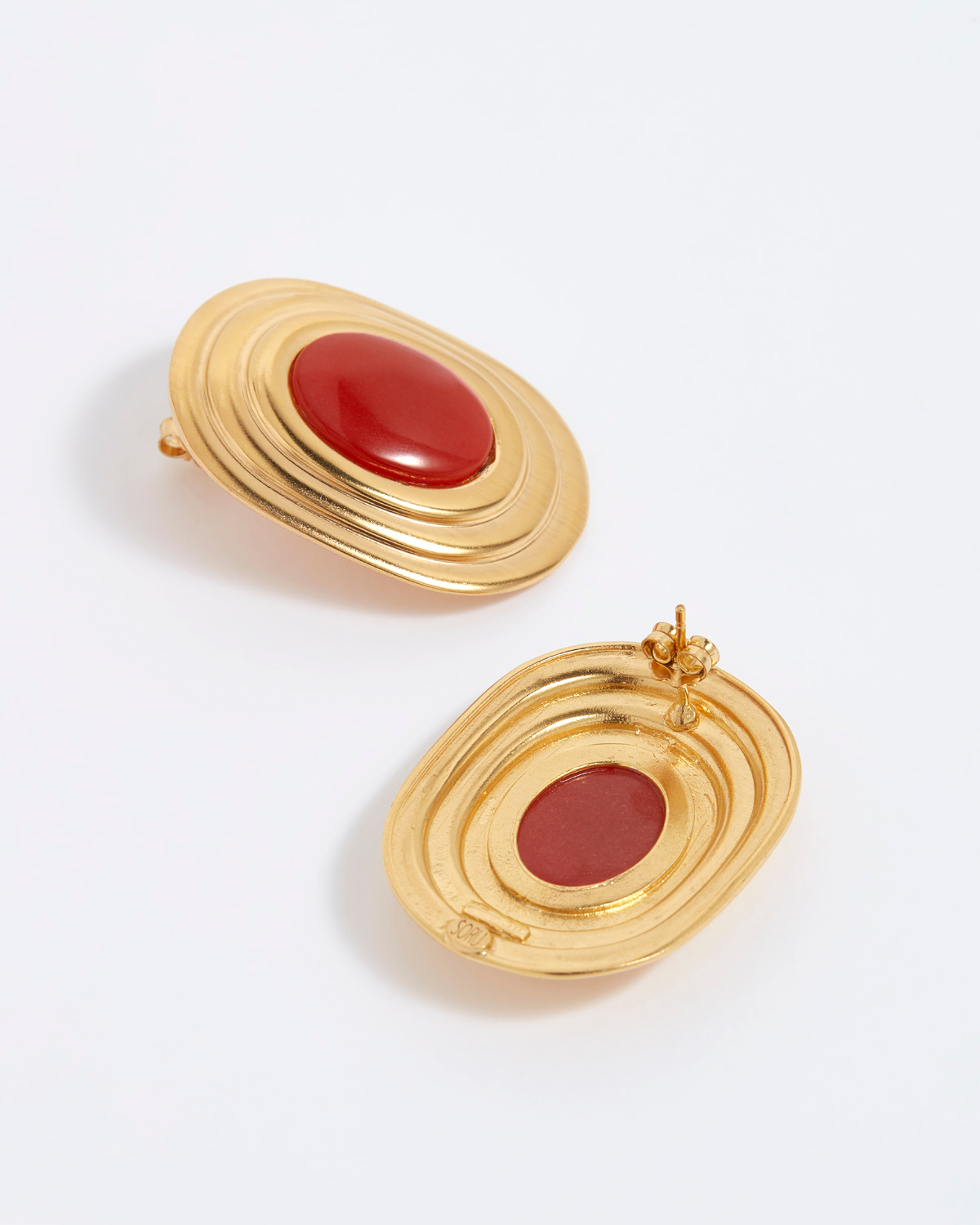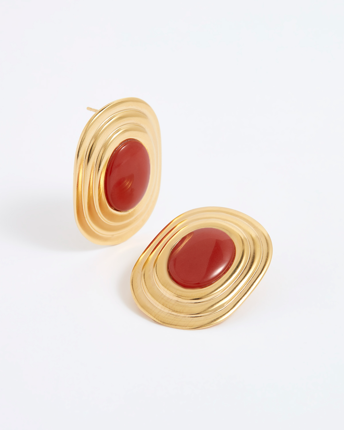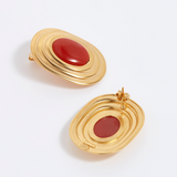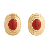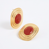 Chic oversized stud earrings featuring an oval rust-coloured gemstone surrounded by 18k gold plated silver stepped frame for a vintage feel.